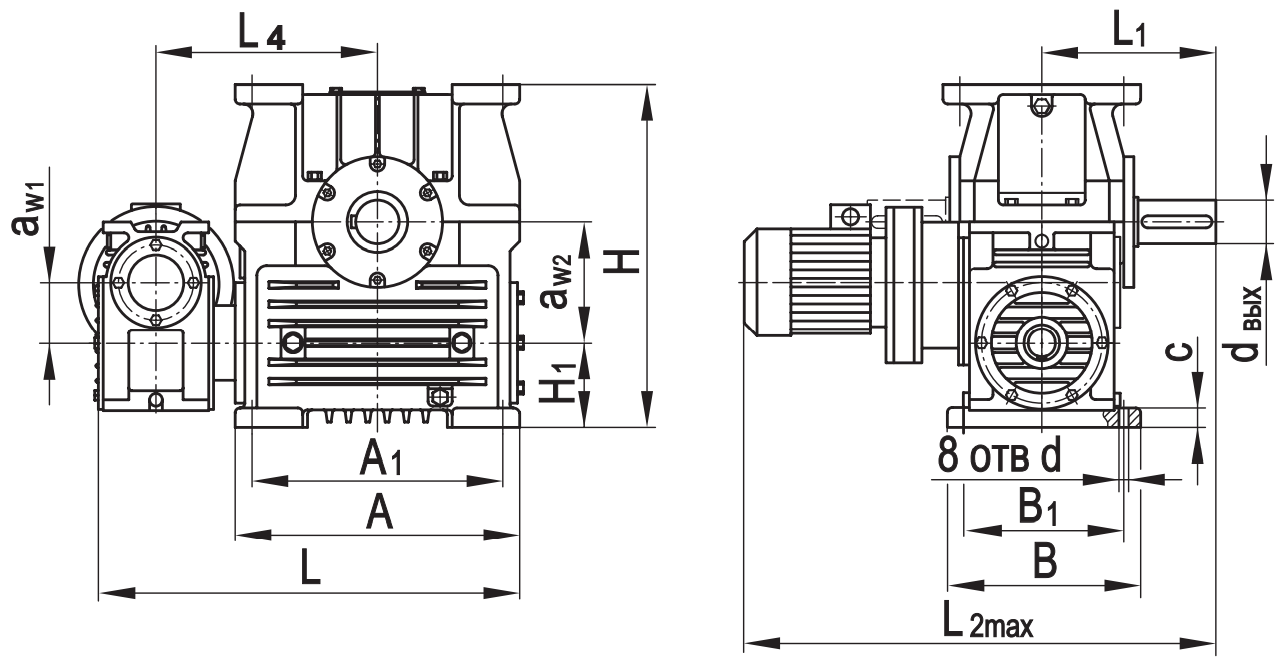 Типоразмер аW1 аW2 А А1 В В1 L* L1* L2max L3* L4 Н Н1 с d dвх dвых